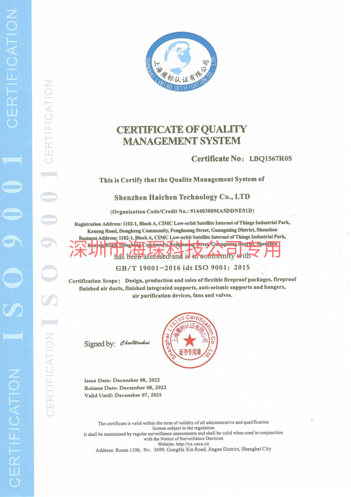 质量管理体系认证证书