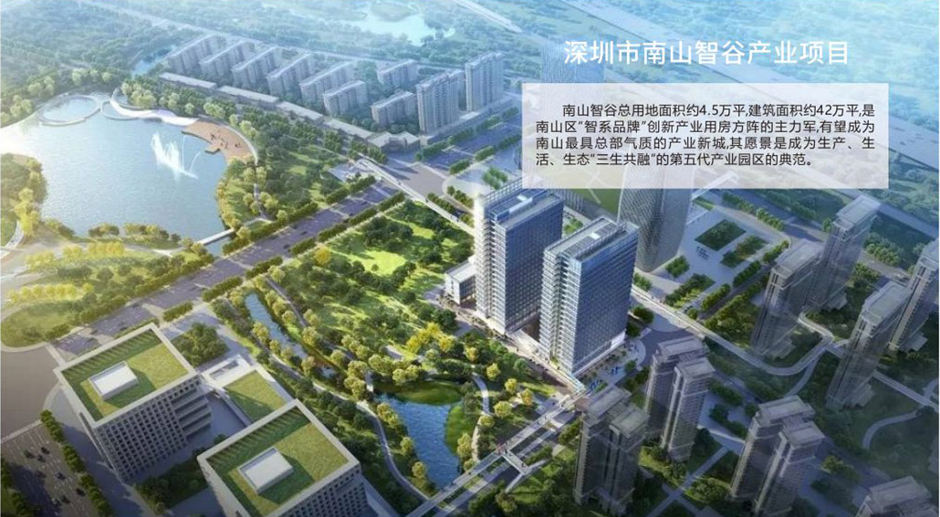 南山智谷总用地面积约4.5万平建筑面积约42万平,是南山区"智系品牌"创新产业用房方阵的主力军,有望成为南山最具总部气质的产业新城,其愿景是成为生产、生活、生态”三生共融“的第五代产业园区的典范。